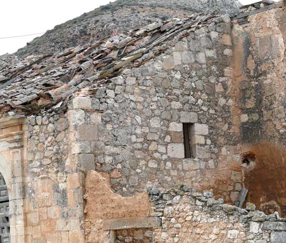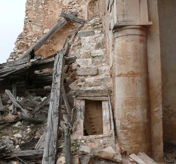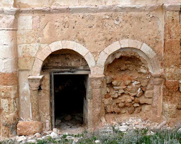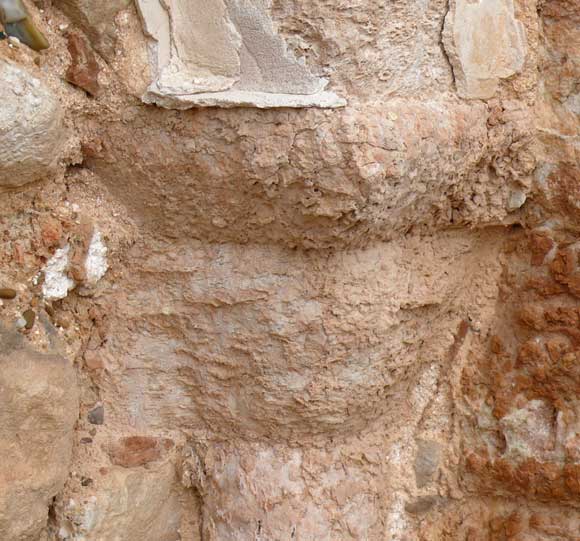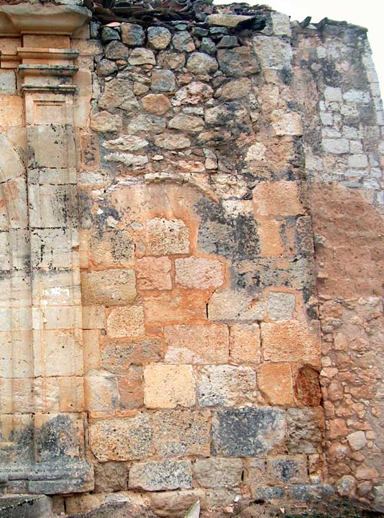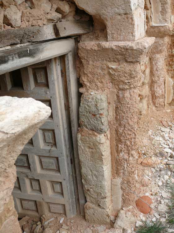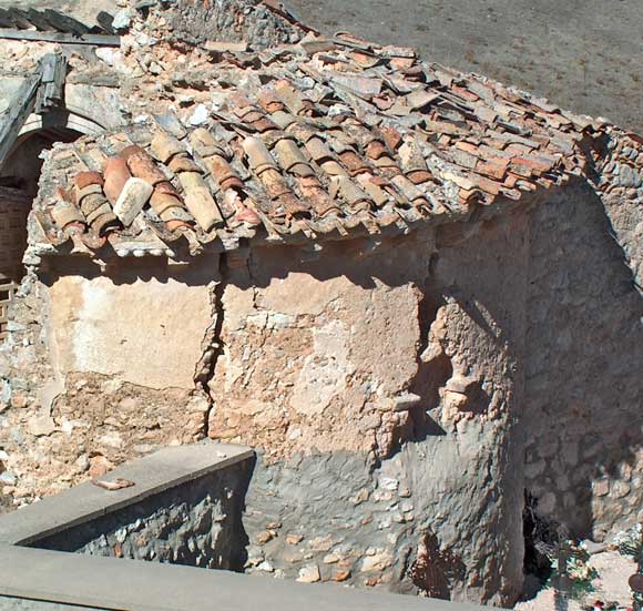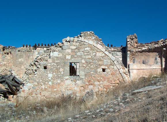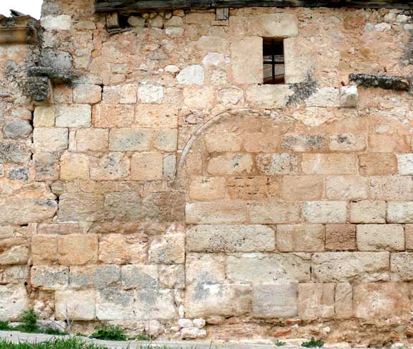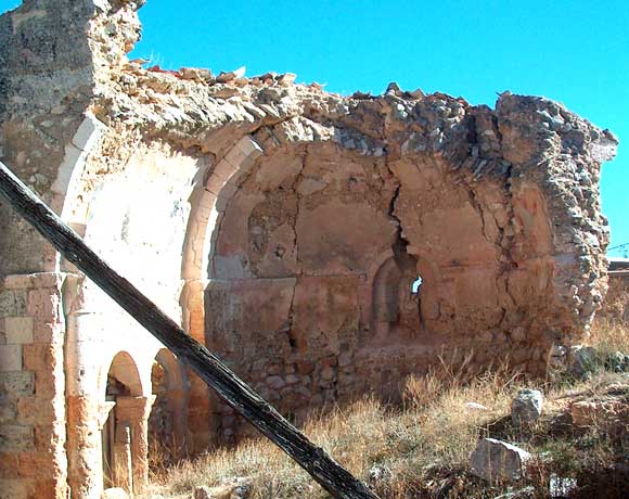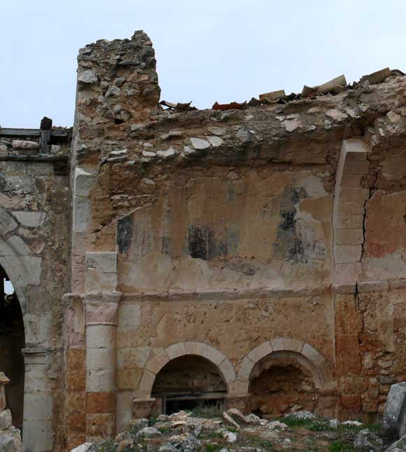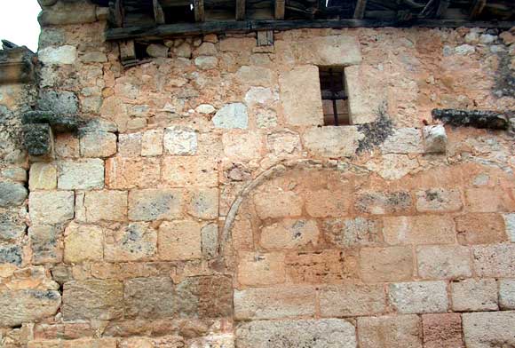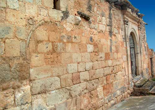 La nave se cubría con armadura de madera a dos aguas de la que sólo restan las cabezas de algunos de sus tirantes empotrados en los muros. De su techumbre nada queda. Sí se mantiene en pie una parte del muro meridional correspondiente a un arco ciego. Dada la tipología de la fábrica original no es posible que tal arco perteneciese a ella. Por alguna ignota razón, en fecha posterior a la de la construcción del templo se dispuso ese arco ligeramente apuntado que, por sus dimensiones, no es el de una segunda portada, pero que tampoco cumple funciones de descarga pues bajo él no hay vanos que liberar de los esfuerzos estructurales. El caso es que su pétreo esqueleto ocluido por una mampostería más o menos concertada ha resistido mejor que el aglomerado arcilloso del resto del muro y todavía se mantiene erguido. |