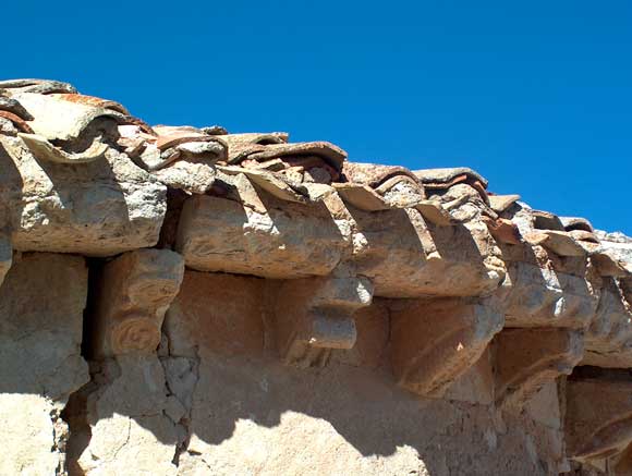 La foto corresponde al extremo izquierdo de la galería al que se adosó luego la sacristía. Se aprecian, en efecto, dos ménsulas, una tallada en forma de cabeza animalesca y otra que ya no es más que un muñón informe. Por toda muestra de cómo era el alero aguanta incrustada en la pared una piedra adornada con bolas de la misma hechura que las del ábside, además de un fragmento de la piedra angular. Se vislumbran con claridad las chambranas de los dos arcos extremos, pero ningún otro elemento de ellos. |