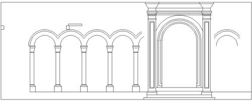 Por fin, a la derecha de la actual portada se marca una única chambrana correspondiente al último arco de los conservados. En el gráfico anterior no he dibujado las columnas de este arco como posiblemente existentes pues soy de la opinión de que se han perdido. Esta afirmación y otras cuestiones que pueden conducir al esclarecimiento de cómo era en su origen la galería porticada merecen una discusión pormenorizada. La haré a continuación. |