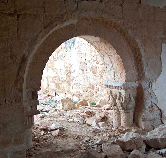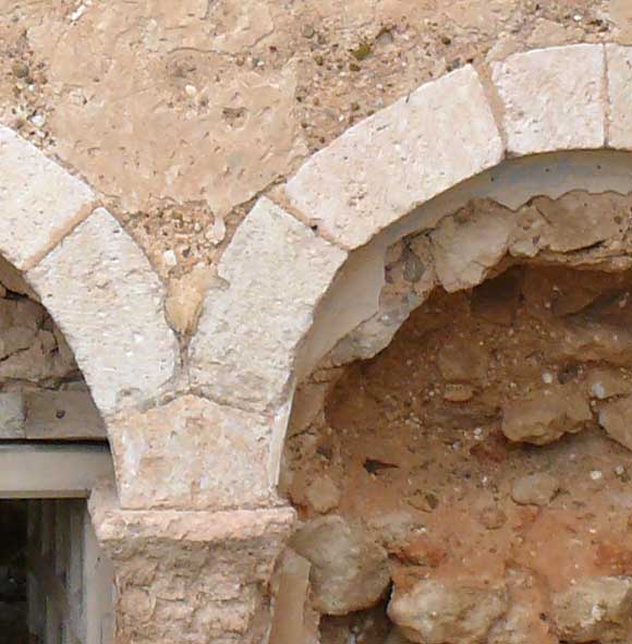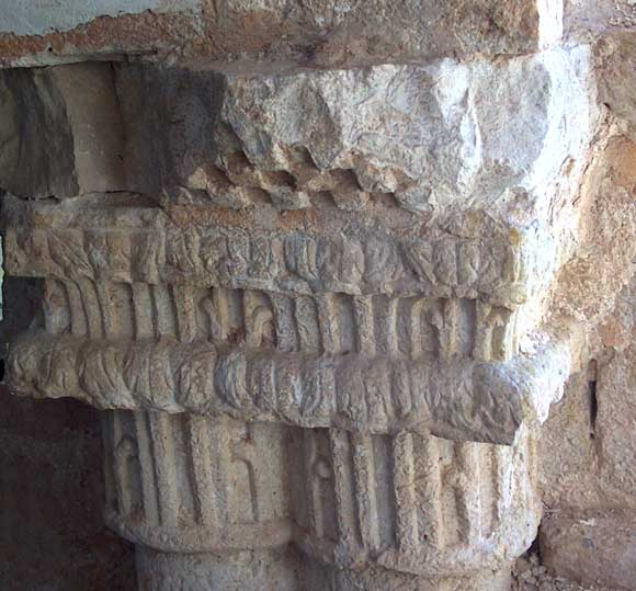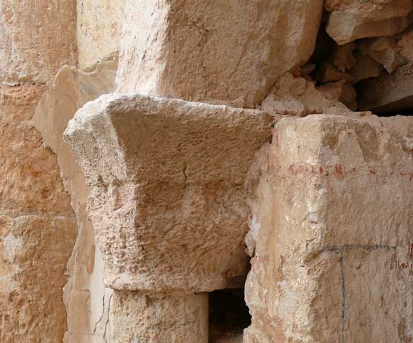 Otro tanto puede decirse del apoyo izquierdo de la arcada. Se trata de una columna de la que tan sólo se conserva el fuste delantero; no obstante, la base del capitel pone de manifiesto que se sustentaba en dos fustes, de los que el del fondo se ha removido para dar alojamiento a la jamba de la puerta. También aquí se aprecia con claridad que el capitel es doble de una sola pieza embutido en su mitad posterior en la fábrica de cerramiento, y que el salmer, de tanto fondo o más que el ábaco, ha sido recortado para dejar espacio al dintel. La columna del otro extremo, aunque más oculta que las demás, aún deja ver que dispone de un capitel doble con su lado corto al frente como los otros. |