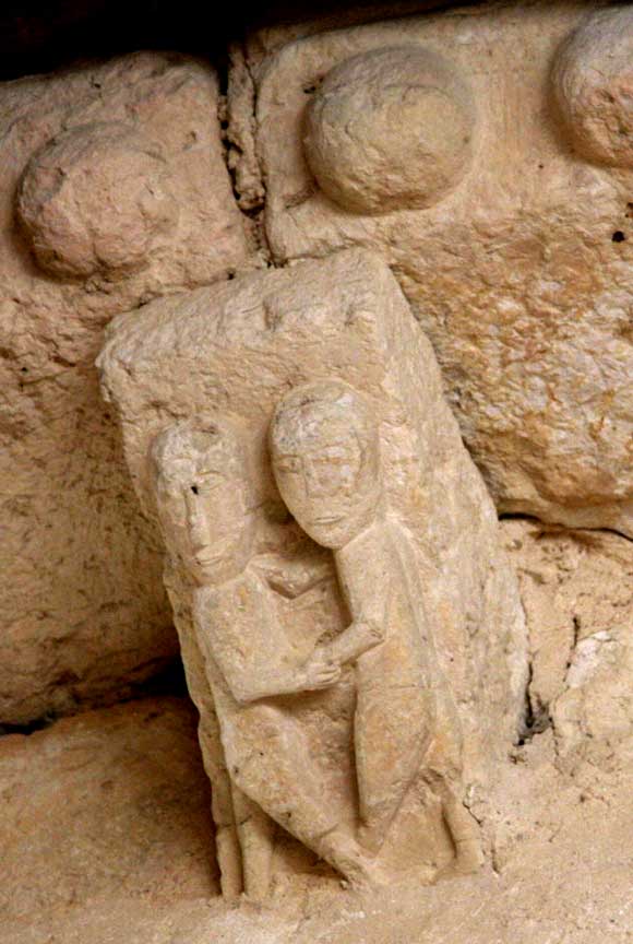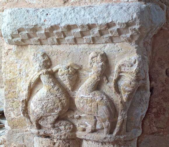 Los dos capiteles son bien distintos entre sí: el situado en el apoyo septentrional del arco contiene una composición simétrica formada por dos parejas de arpías en torno a dos árboles o arbustos que ocupan las aristas del capitel. De tales plantas surgen largos tallos que se enrollan en los cuellos de estas fantásticas aves con cabeza de mujer y cola conoidea que pasan entre las patas por debajo del cuerpo. Estas figuras fabulosas proceden de Silos y están muy estendidas por la región con formas y actitudes parecidas. |