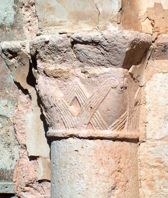 El arco triunfal es asimismo de medio punto, éste doblado y soportado por columnas adosadas al muro. El capitel que se conserva, el del lado izquierdo de la nave, exhibe una sencilla decoración de haces de estrías incisas entrecruzadas y rematadas en volutas. Su cimacio, hoy liso sin distinción con respecto al resto de la imposta, debió ser ajedrezado tal como lo vio en su día Teógenes Ortego. La basa de la columna existente queda oculta por los escombros y no es visible de momento. |