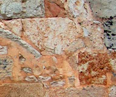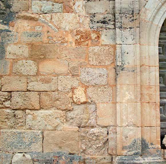 Este es el muro que cierra la galería por su lado occidental. Se encuentra con el muro norte de la nave en el lugar en el que se inicia la bóveda que soportaba el coro, tal como se deduce de la planta; cumplía misión de contrafuerte para asegurar la estabilidad del tramo final de la nave. La uniformidad de la fábrica de mampostería de este muro denota que se levantó de una sola vez, lo que hubo de suceder cuando la reforma de la galería que incluyó la portada obligó a elevar aquella hasta su actual rasante. En ese momento es cuando debió derribarse el último arco de la galería para trabar el nuevo muro con el de cerramiento de aquella, lo que dio lugar a la formación de la arista de sillares que perfila ese ángulo en toda su altura. No cabe duda de que este muro es posterior a la primitiva construcción; lo atestiguan algunos detalles como la utilización entre los mampuestos de sillares bien escuadrados que debieron aprovecharse de anteriores derribos y, más en concreto, la aparición de piedras labradas como las que se muestran en esta imagen que debieron pertenecer a la cornisa de la galería. |