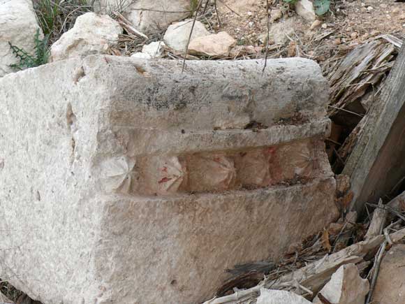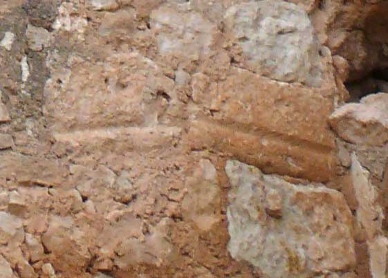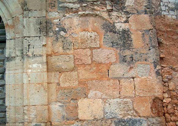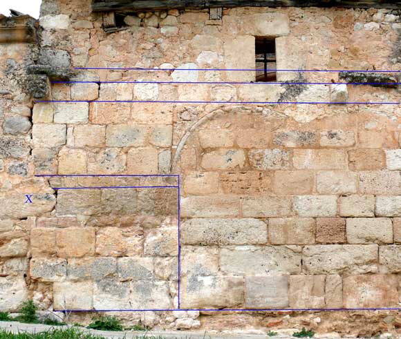 En la jamba derecha de la portada sucede otro tanto, por lo que es aplicable a la misma todo lo antes dicho. También en esta ocasión se adjunta otra imagen relacionada en la que he empleado la misma simbología gráfica que en la anterior. La forma de ensambladura de la portada en el muro hace sospechar que no se conserva la doble columna izquierda del arco 8 que debería recaer en ese preciso lugar. |