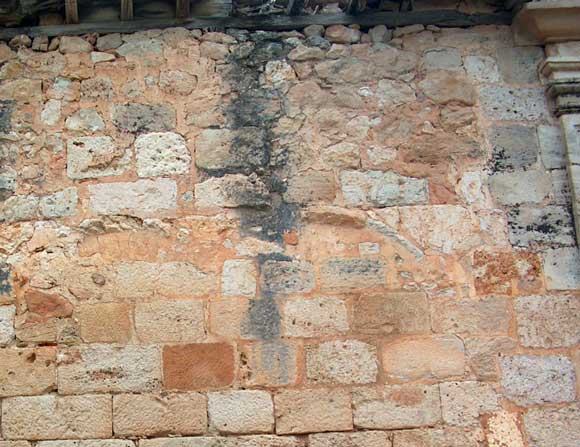 Fuera de esto, lo que más llama la atención son unas inquietantes grietas de desarrollo vertical que no han producido el total derrumbe de la desplomada fábrica por la tenue acción estabilizadora de la tapia baja del cementerio, por el lado sur, y la solidaria presencia de la sacristía nueva , por el norte. |