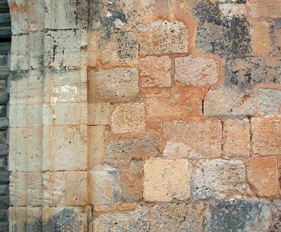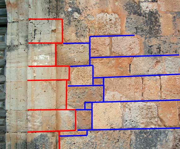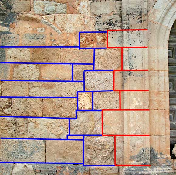 Es elocuente esta imagen sobre cómo se acopló la portada por su jamba izquierda a una fábrica anterior. Para una mejor ilustración puede verse esta otra imagen donde he señalado en rojo el despiece de la portada y en azul el resto de los sillares. Es una buena práctica constructiva la formación de adarajas para trabar dos fábricas entre sí. A estos efectos, los sillares que forman la pilastra moldurada izquierda sobresalen hacia fuera con alternancia en su mayor o menor dimensión para que no haya coincidencia vertical en las llagas. De haberse ejecutado simultáneamente la portada y el cerramiento, se hubiera impuesto el despiece de aquélla y se habrían ajustado a él las hiladas del resto de la fábrica que se habrían desarrollado en perfecta concordancia. Pero aquí queda patente el desacuerdo entre las dos fábricas cuyo forzado acople ha exigido la interposición de una serie de sillares no prismáticos y desfasados para efectuar la transición entre las hiladas del cerramiento y los bloques pétreos de la portada. |