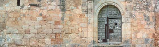 Llama la atención su posición descentrada, de forma que el arco derecho se arrima estrechamente al fajón del ábside mientras que el izquierdo queda ostensiblemente separado del arco triunfal. En la ya mencionada iglesia de San Martín, en Rejas de San Esteban, también existe una pareja de arcos ciegos a cada lado del presbiterio, pero allí en perfecta disposición centrada y simétrica como es lo habitual. En Alcozar no sucede esto y no resulta difícil intuir las razones de tal comportamiento. De haberse tratado de arcos ciegos puramente ornamentales realizados en origen no hubiera existido impedimento alguno para disponerlos de manera más equilibrada dentro del paramento presbiterial; pero se colocaron más tarde, cuando se construyó la sacristía, estando destinado el más próximo al arco triunfal a proporcionar acceso a esta nueva estancia. Si se observa el esquema de la planta se verá que en el encuentro del muro oriental de la galería con el templo, en el lugar de quiebro del presbiterio y la nave al trasdós del arco triunfal, se produce un potente macizo que condiciona la apertura de huecos en esa zona, algo apreciable asimismo en esta imagen en la que se manifiesta por encima de la cubierta el espesor del muro a cuyo pie se ajusta la puerta. Necesariamente había que salvar ese muro si lo que se pretendía era abrir un paso bajo el arco contiguo. |