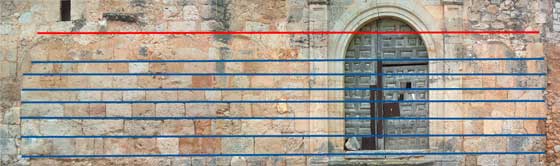 En estas imágenes panorámicas de la fachada completa de la galería, en la inferior de las cuales he trazado en rojo una línea tangente a las chambranas y he marcado en azul los tendeles para una mejor definición de las hiladas, se observan sin esfuerzo dos cosas: por una parte, que la chambrana situada a la derecha de la portada está descolgada con respecto a las demás, dando a entender que ese arco está falto de los primitivos apoyos, esto es, que carece de las columnas que lo soportaban; por otra parte, que existe continuidad de las hiladas de sillares a uno y otro lado de la portada, la cual, como ahora veremos en detalle, ha sido encajada con posterioridad en la fábrica de cerramiento previamente existente.