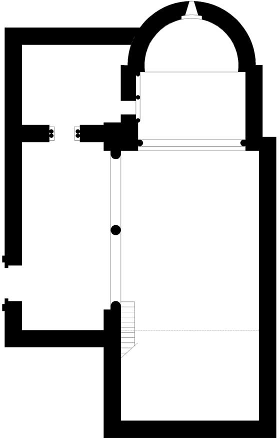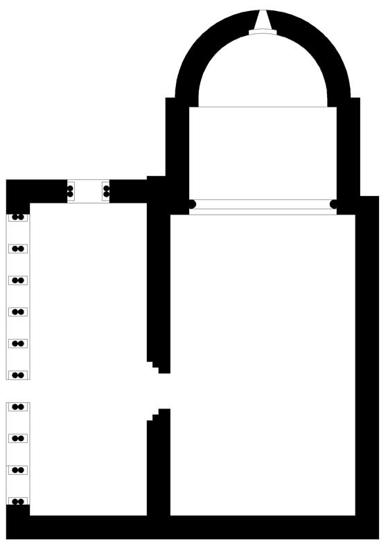 Esta sería la traza en planta de la iglesia en su última fase antes de entrar en ruina. La comparación de este esquema con el de la supuesta planta original pone de relieve el proceso de reformas al que habría sido sometida a lo largo del tiempo. Pueden concretarse tales cambios en: