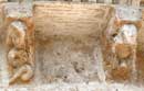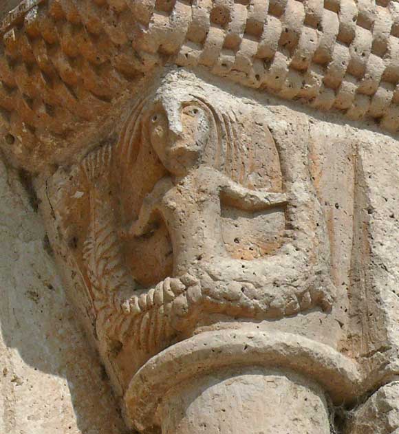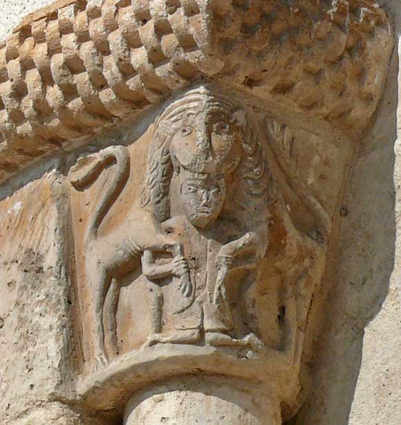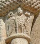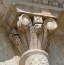 Similar tratamiento han experimentado los capiteles del lado derecho. Los dos exteriores muestran hojas que terminan en frutos bulbosos o en volutas; sus cimacios se adornan con florones circuidos por zarcillos. El capitel interior es figurativo, representando una escena de caza en la que un perro galgo está apunto de apresar a un conejo o liebre. Su cimacio lo ocupan dos cuadrúpedos de aspecto felino o leonado. |