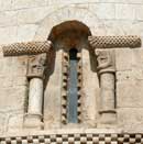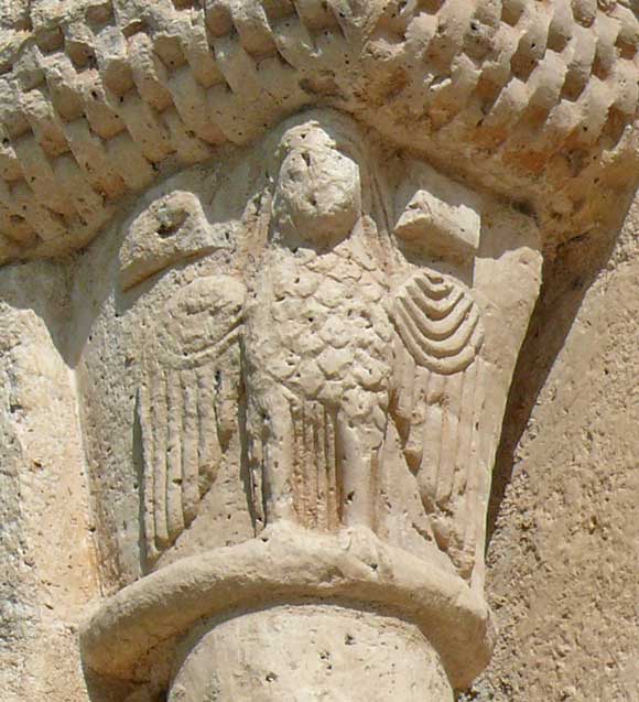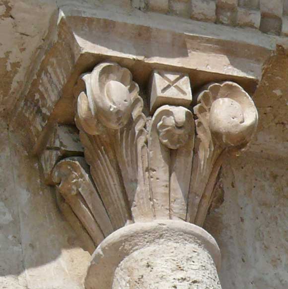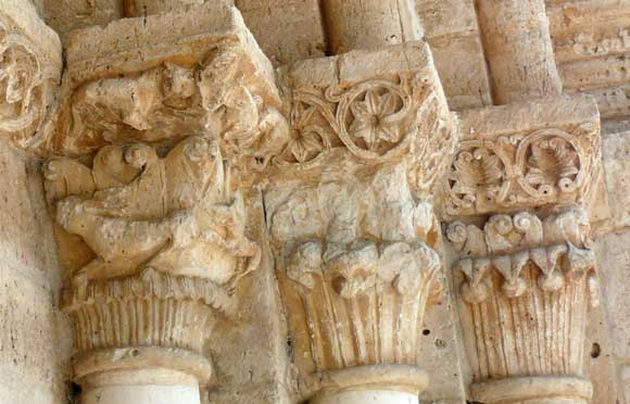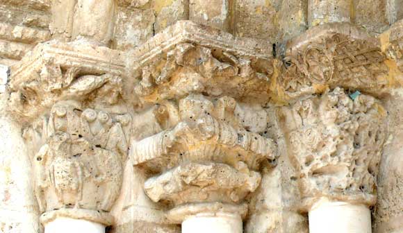 De los tres capiteles del lado izquierdo, los dos interiores se adornan con motivos vegetales con abundancia de volutas y roleos; el otro muestra un ave de rapiña posada sobre el astrágalo en la arista del capitel que parece ser picoteada por otras dos aves que ocupan las caras del mismo. Los cimacios gozan de cierta originalidad: el del capitel exterior, en coherencia con los rasgos aviarios de éste, muestra varias cabezas de pájaro; el central, bastante estropeado, es foliáceo vegetal; el interior no es homogéneo, sino que en una de sus caras se exhiben dos rosetas enmarcadas en círculos y en la otra una labor de cestería. |