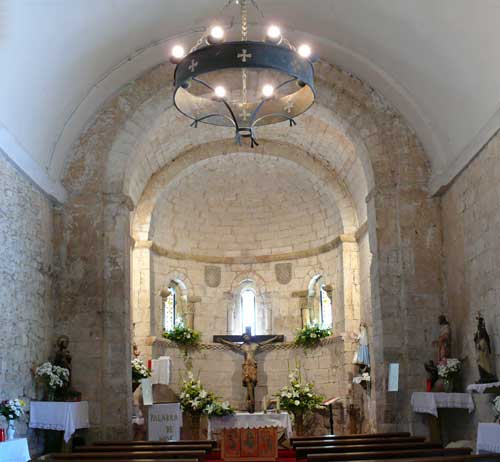En el interior, como ya se apreciaba al exterior, se distinguen con claridad los tres espacios de que se compone la iglesia: la nave de dos tramos y bóveda de ladrillo revocado con yeso que debió sustituir a una primitiva bóveda de piedra o, lo que es más probable, a una cubierta de armaduras de madera, el presbiterio de menor anchura que la nave, y el ábside de luz aún más reducida, lo que da lugar al característico escalonamiento de estas tres piezas. La bóveda del presbiterio es de medio cañón; la del ábside es de horno.