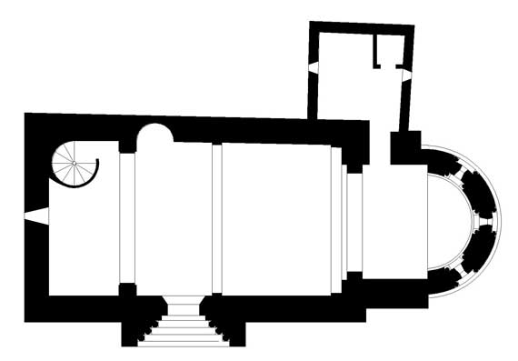 Iglesia de una sola nave cuya cabecera está formada por ábside semicircular y presbiterio recto. Al costado septentrional del presbiterio se adosó posteriormente la sacristía. La portada se abre en el muro meridional descentrada hacia los pies con respecto al eje transversal de la nave. |