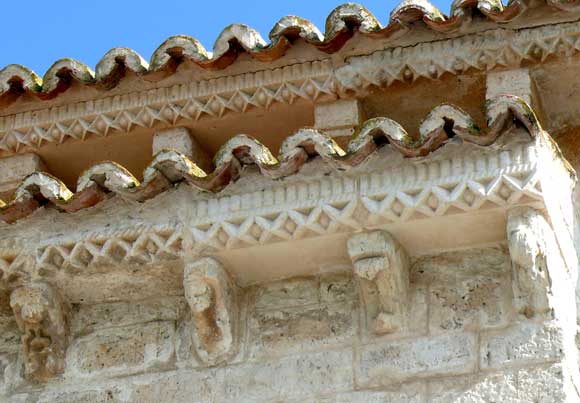 La cornisa de la portada, como la de la nave, está decorada frontalmente por una sucesión de estrellas de cuatro puntas y abultamientos perlados, sobre la que corre un filete sogueado y, por encima de ambas cenefas, una moldura de rollos verticales. Se sustenta en modillones tallados con variedad de formas dorativas. |