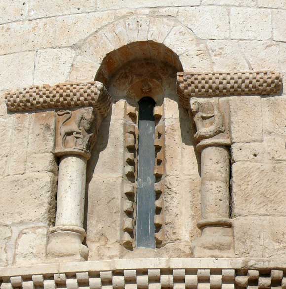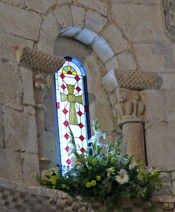 Interiormente las ventanas del ábside tienen un aspecto muy parecido al exterior: arco de medio punto que arranca desde unos gruesos cimacios algo avanzados a modo de esbozo de imposta, capiteles y basas de gran altura en relación a la longitud total de la columna y fustes desproporcionadamente robustos y chaparros. Los capiteles de las ventanas laterales tienen una composición común: una figura humana o quimérica con la cabeza en el vértice del capitel cuya decoración se completa con algunos elementos botánicos. La ventana central fue mutilada en alguna ocasión en que se debió instalar un camarín, habiéndose cercenado los cimacios y lastimado los capiteles. En la siguiente galería de imágenes pueden observarse con detalle todos los capiteles.
