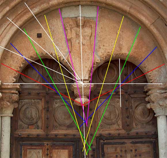 Una mirada atenta a la primera de las adjuntas imágenes ya denota que las líneas de división del tímpano no tienen un origen común. Para ratificarlo basta prolongar las líneas de junta y observar su trazado; es lo que recoge la segunda de las imágenes. Admite algunas consideraciones: