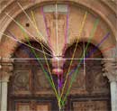 - El mejor comportamiento de las piezas del tímpano en orden a su estabilidad se obtendría haciendo que las situadas en los cuadrantes exteriores de los dos arquitos funcionasen como dovelas de los mismos, esto es, que sus líneas de unión pasasen por los centros de dichos arquitos. En el de la derecha existe una cierta aproximación a tal supuesto, de forma que las líneas verde, azul y roja no se separan demasiado del centro del arquito.