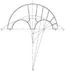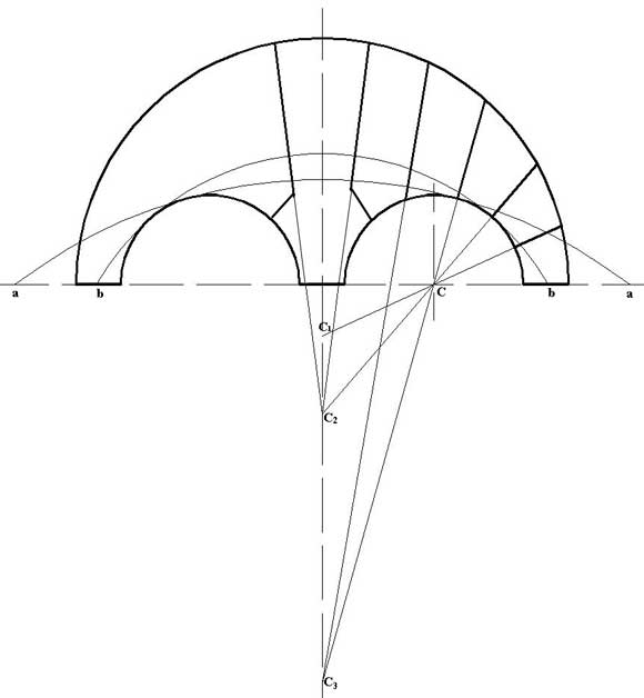 - Llevando todas estas conjeturas a una representación geométricamente exacta se obtiene un esquema de trazado como el que aquí se presenta. Los puntos C1, C2 y C3 son los orígenes de las líneas divisorias de las piezas externas, líneas que concurren en el centro del arquito. Por esta razón, los círculos trazados con dichos centros, tales como los a-a y b-b, son tangentes a los arquitos en los puntos en los que los intersectan los respectivos radios.