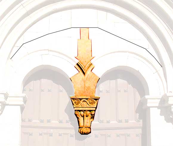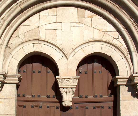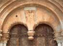 En el tímpano de Santiago del Burgo se eligió otra solución: una gran pieza central dentada para lograr el mejor acodalamiento y unos planos de deslizamiento que operan a modo de arco de descarga. Los arquitos poseen su propio dovelaje tradicional. |