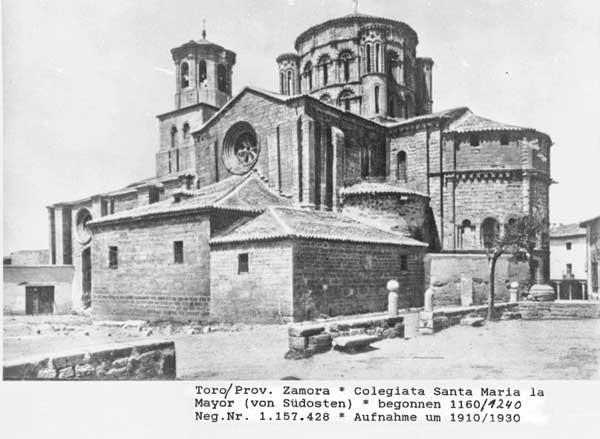 En 1958 todos esos postizos habían desaparecido. En efecto, en esa fecha la Dirección General de Bellas Artes organiza una exposición bajo el título «Veinte años de restauración del Tesoro artístico y monumental» que recopila las actuaciones llevadas a cabo entre 1938-58 por la Comisaría de Defensa del Patrimonio Artístico Nacional. Con tal motivo la Dirección General de Bellas Artes editó un catálogo de la exposición en cuya lámina CLVIII se muestra esta fotografía del estado de la Colegiata en ese momento tras la restauración de Pons-Sorolla. No obstante, esas obras de restauración debieron ejecutarse en dos fases, pues en el catálogo de fotos Orte correspondiente a Toro en www.bildindex.de se encuentra esta fotografía de hacia 1910-30 en la que se observa que, si bien no se ha derribado todavía la construcción adosada a la sacristía y existe un muro bajo por delante de la cabecera, el ábside de la epístola queda frontalmente despejado y las ventanas del ábside central lucen en su original hechura, aunque persiste el cuerpo superior de dicho ábside. |