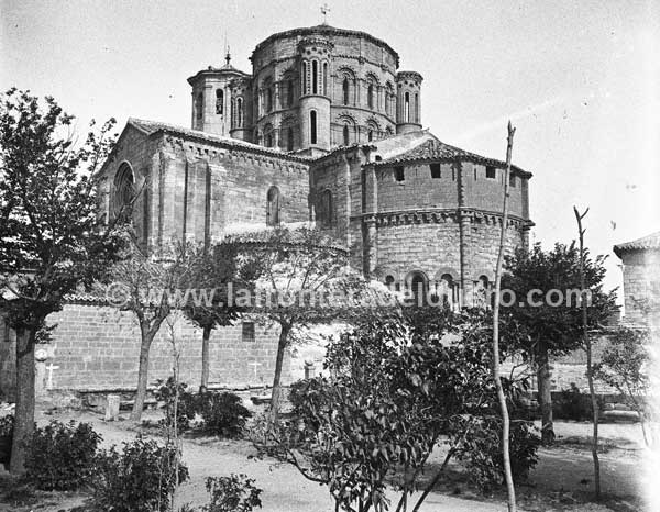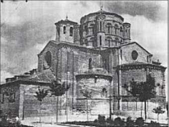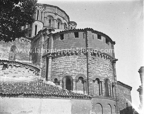 La comparación de esta imagen de conjunto con la que encabeza la presente página pone de manifiesto la existencia de notables diferencias: existían una serie de construcciones bajas que envolvían el ábside de la epístola y parte del central adosadas al muro oriental del brazo sur del transepto y a la sacristía que da prolongación al mismo y que aún subsiste; el ábside principal tenía remontado su tambor de forma que ocultaba la parte superior del hastial de la nave central; también el cimborrio se había sobreelevado con un anillo ciego por encima de la actual cornisa y su cubierta era de escasa pendiente; las torrecillas unidas al cimborrio poseían una cubrición casi plana inapreciable desde el exterior que daba la impresión de estar inacabadas. |