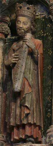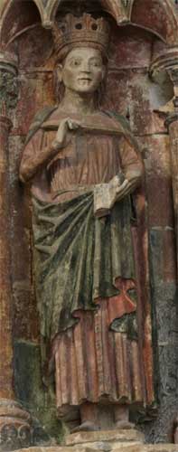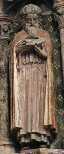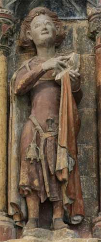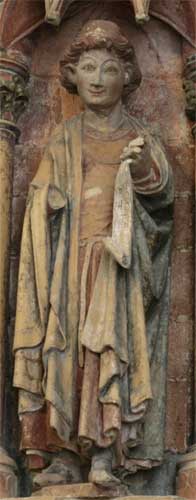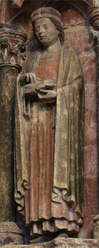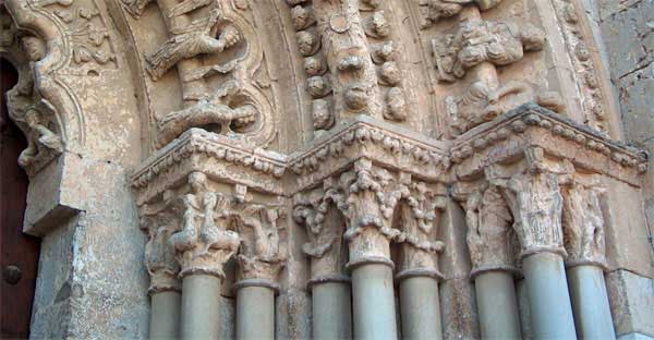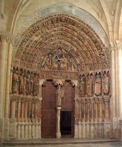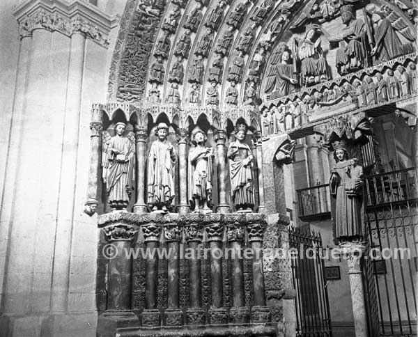 Sólo las columnas que habían de soportar las arquivoltas pertenecen al periodo románico, es decir, al de construcción del templo, aunque fuese en su fase final ya entrado el siglo XIII. No dejan de ser atípicas por la aparente formación de un doble orden superpuesto, si bien el inferior es más bien un alto podio cuyo paramento no es liso sino compuesto de una sucesión de semicilindros en correspondencia con las columnas. Los esperados arcos que estribarían sobre la columnata no se ejecutaron nunca y en su lugar, para alcanzar la altura del hueco adintelado, se levantaron ocho hornacinas que albergan otras tantas figuras estáticas de unos personajes cuya disposición a uno y otro lado de la portada pretende guardar una cierta simetría: así, al interior, dos reyes de Judá: Salomón a la izquierda y David a la derecha; las dos figuras centrales de ambos grupos son imágenes de profetas: Isaías y Daniel a la izquierda y Jeremías y Ezequiel a la derecha; por fin, las figuras extremas pertenecen a dos ángeles o arcángeles: el de la izquierda sin identificar y Gabriel a la derecha.