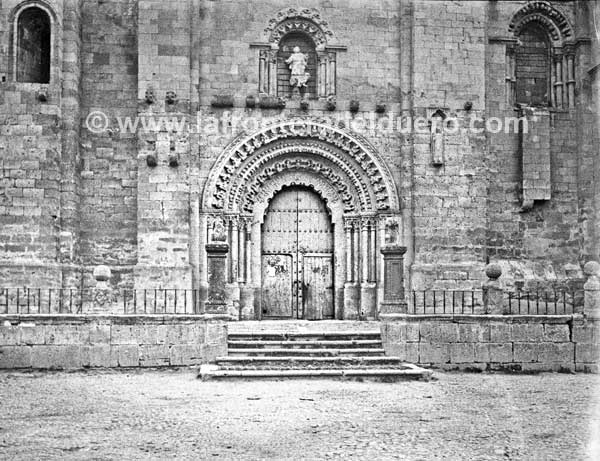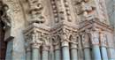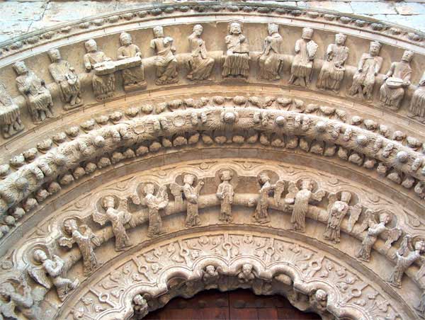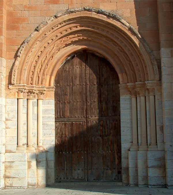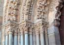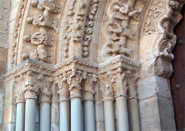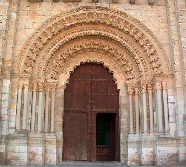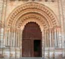 Esta portada, como la opuesta del lado Norte, es atribuible al primer maestro o taller que intervino en la construcción de la colegiata y puede datarse hacia 1170. Arco ligeramente apuntado compuesto por cuatro arquivoltas, de las que la interior descarga sobre las jambas de la puerta y las otras tres sobre otras tantas columnas elevadas sobre alto podio. Las arquivoltas son baquetonadas y se adornan con sencillos motivos geométricos y vegetales. |