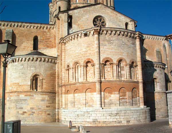 Cada una de las naves está encabezada en su extremo oriental por un ábside de planta semicircular, el central más prominente y de mayor altura. Descansan los ábsides sobre un basamento y se dividen horizontalmente en dos cuerpos, de los que el inferior es ciego en todos los casos, pero, mientras que su paramento es liso en los laterales, forma una arquería de escaso relieve en el central. En el cuerpo superior de los laterales se abre una estrecha ventana bajo arco de medio punto con columnillas y capiteles. En el del ábside principal se disponen tres grupos de tres arcos de similares características, de los que sólo uno de cada terna alberga una ventana. Cuatro columnas encastradas recorren el ábside central en toda su altura dividiéndolo en tres calles verticales. |