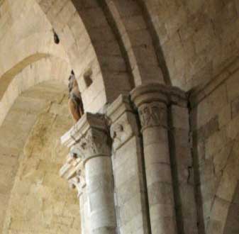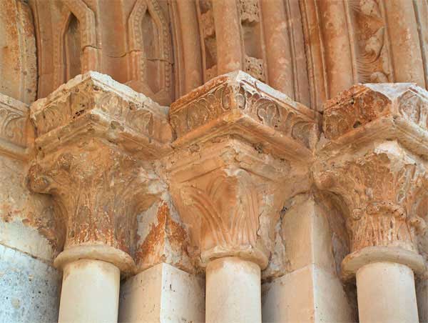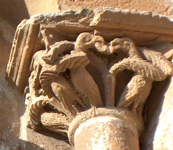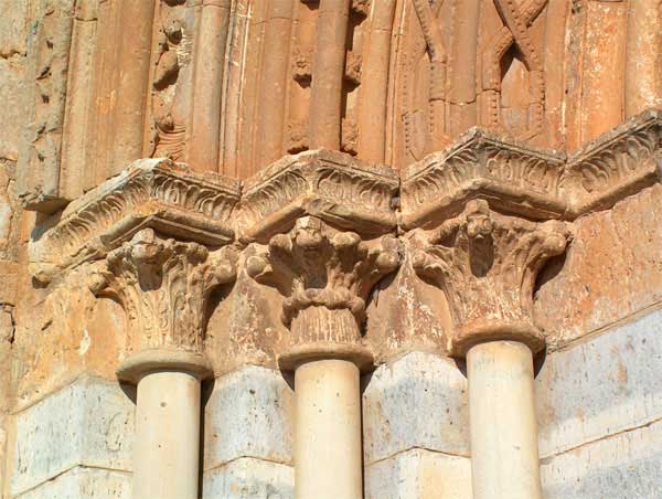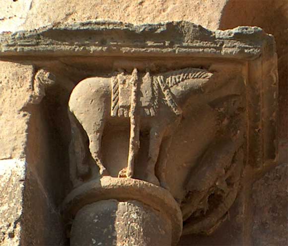 La columnas que soportan los arcos, ciegos o ventanales, de los tres ábsides están coronadas por sendos capiteles en su mayor parte de ornamentación vegetal, en algunos casos muy deteriorada. No obstante, uno de esos arcos presentas dos capiteles con figuras de cierto interes: uno de los capiteles muestra en su cara frontal un caballo ensillado y listo para montar, de un realismo poco propio de la iconografía románica; el otro capitel representa una aves de rapiña de corvos picos entrelazados por palmas. |
