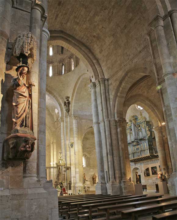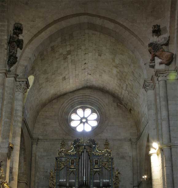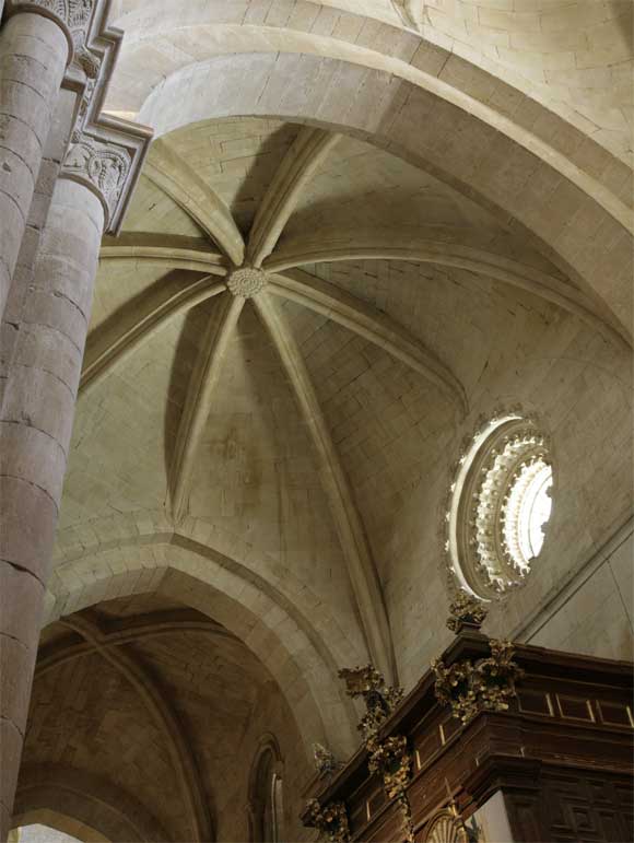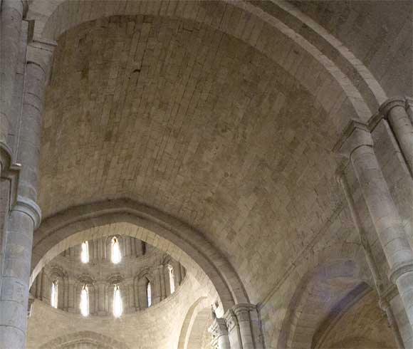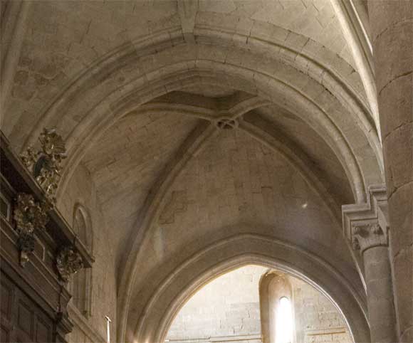 Bóveda de cañón apuntado reforzada por arcos fajones doblados. Hay que hacer notar que esta forma de cubrición estaba ya superada por otros tipos más avanzados, como el de crucería. Éste se había empleado anteriormente en las naves laterales, no obstante en la central se retorna a modelos más primitivos que debieron parecer menos arriesgados. La adopción de la bóveda de cañón fue una decisión de última hora, pues los pilares cruciformes que la habrían de soportar estaban dotados de columnas adosadas para apeo de unas nervaciones inexistentes, por lo que han quedado sin funcionalidad y terminan inesperadamente a la altura de la imposta, como puede apreciarse aquí. |