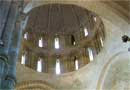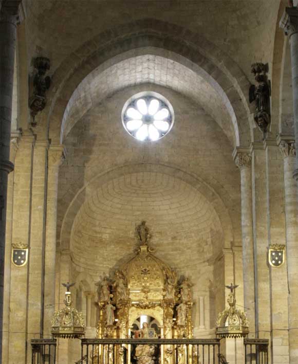 La capilla mayor (a la que corresponde la adjunta imagen) posee bóveda de horno. El presbiterio se cierra con bóveda de cañón apuntado como una prolongación de la bóveda de la nave central. Las capillas laterales, tanto la izquierda como la derecha, se cubren asimismo con bóvedas de horno, pero, a diferencia de la capilla principal, los espacios rectos que las preceden poseen bóvedas de cañón semicilíndrico. El abovedamiento de la cabecera conforme a cánones netamente románicos es indicativo de que esta parte del templo se erigió en primer lugar, con anterioridad a las naves y al transepto. |