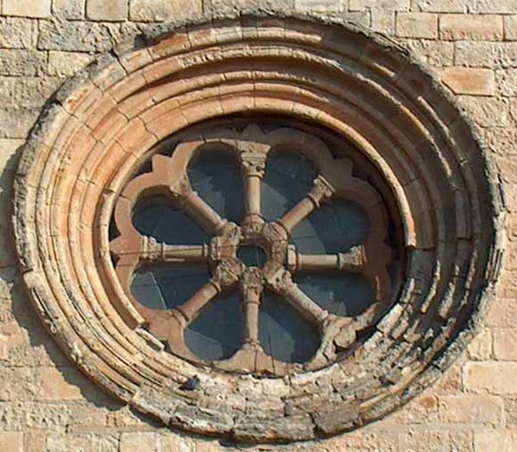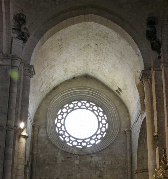 Rosetones Seis rosetones de diverso tamaño y trazado completan los huecos por los que recibe luz el templo: tres de ellos se abren en sendos hastiales de las dos alas del transepto y del presbiterio, otro sobre la portada meridional, y dos más en las dos caras exteriores del último tramo de la nave derecha.