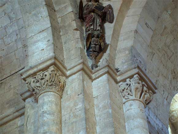 Con independencia de las tallas, imágenes, retablos y otros elementos decorativos con que cuenta el templo en su interior, entre los arquitectónicos hay que mencionar los capiteles de las columnas adosadas a los soportes de los arcos torales. Algunos de ellos contienen representaciones de temas vegetales, a base de hojas, palmetas, bulbos, etc. Pero otros, como el más divulgado de Daniel entre los leones, muestran escenas bien compuestas y labradas. Pueden apreciarse en la siguiente