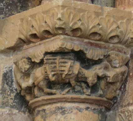 Los capiteles responden a temas muy dispares: el de la imagen adjunta, el exterior del lado izquierdo, representa una escena profana, inserta en una leyenda popular, en la que una acémila cargada de leña se resiste a caminar sin que dos personas que tiran de ella o la empujan lo logren; su opuesto del lado derecho muestra unas aves monstruosas de largas colas y no menos largos cuellos que se entrelazan afrontando las cabezas de aspecto de reptil de dos de ellas; algunos capiteles presentan toda una variedad de formas vegetales; otros, por lo general bastante deteriorados, relatan el nacimiento de Jesús, la adoración de los Reyes Magos, la matanza de los inocentes y otras citas evangélicas relativas a la infancia de Cristo.