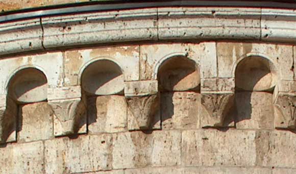 Las cornisas de los tres ábsides están formadas por arquillos que descansan sobre ménsulas piramidales invertidas. Estos pequeños arcos de estilo lombardo, tan profusamente usados en el románico catalán, son comunes a otras zonas del Duero en las que se realizaron edificaciones tardías, ya iniciado el siglo XIII. Así, en el ábside de San Miguel de Bordecorex se ven estos mismos arquillos, aunque allí las ménsulas sean de rollos, lo mismo que sucede en San Miguel de Caltojar, donde se escalonan en un doble orden. |