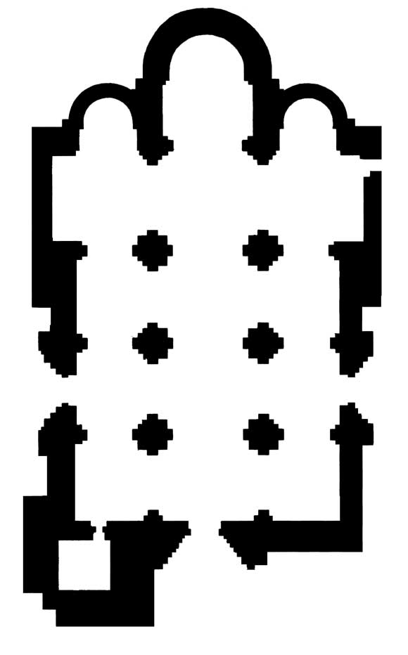 En la adjunta figura se recoge un esquema de la planta del templo sin los añadidos posteriores: la sacristía que prolonga el ala sur del transepto, y el atrio (en algún tiempo capilla y hoy recinto cerrado) que precede a la portada occidental.