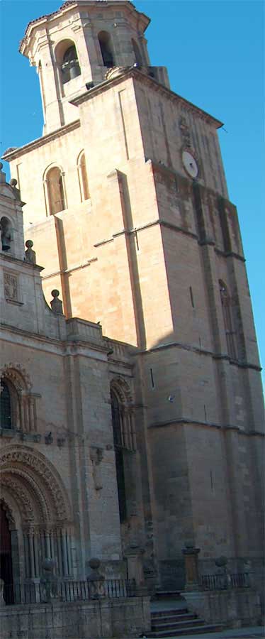 Ya se ha dicho con referencia a la planta de esta Colegiata, en relación con la de la Catedral de Salamanca, que ambas construcciones presentan identidades en algunos aspectos, entre otros en la ubicación de la torre en el extremo norte de la fachada occidental. Se trata de un prisma de sección cuadrada con contrafuertes y recios muros, salvo en el ángulo noroeste en el que se aprecia una merma de espesor incomprensible desde el punto de vista constructivo que debió responder a otros imperativos; lo cierto es que la precaria estabilidad de su estructura dio lugar a las primeras obras de consolidación a comienzos del siglo XVI y a unas segundas y definitivas dos siglos después. En esta ocasión se demolió la parte cimera de la torre y se construyó en su lugar el actual pináculo ochavado. |