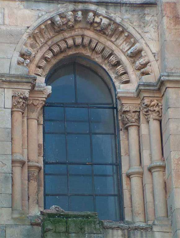 Ventanas Como se acaba de indicar, los ábsides están hendidos por estrechas ventanas que poca iluminación aportan al interior de las capillas de la cabecera. Para reforzarla existe una sencilla ventana en el paramento oriental del transepto, por encima de la bóveda de cada ábside lateral, y dos ventanas más del mismo tipo a los lados del presbiterio. Mayor claridad se obtiene a través de las dieciséis ventanas que calan la linterna del cimborrio. En la fachada norte se abren tres ventanas de mayor porte y de variada hechura de las que cabe destacar, por su original diseño, la situada en el último tramo: dos arquivoltas ojivales decoradas, la exterior con cabezas humanas, una cabeza de cerdo y otras figuras, y la interior con rodillos, descansan sobre tres capiteles de ornato vegetal y un cuarto que muestra extraños lagartos. Los fustes se dividen en dos partes entre las que se interpone un baquetón. |