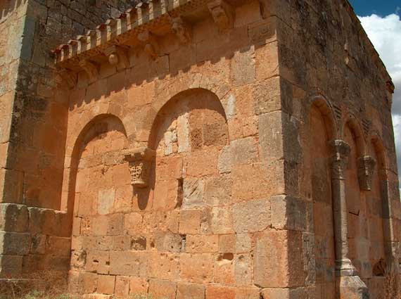 Forma un prisma rectangular de planta casi cuadrada y cubierta a dos aguas. Los paramentos exteriores lucen una arquería ciega de desigual número de arcos en sus diversas orientaciones. En el lienzo oriental voltean tres arquillos que apoyan sobre los machones extremos y sobre las dos semicolumnas centrales. De éstas sólo se conserva una y el capitel de la otra. Las basas, formadas por una escocia entre dos anillos tóricos, descansa sobre alto podio con remate troncopiramidal. |