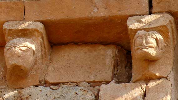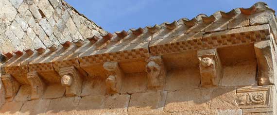 El alero del lienzo meridional tiene su frente liso y el bisel decorado con tacos jaqueses. Lo soportan siete canecillos en forma de nacela, algunos de los cuales alojan en su escocia figuras humanas o grotescas. |