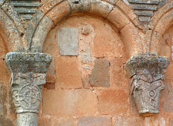 Constan los arquillos de una única arquivolta baquetonada. Ambos capiteles poseen cimacio prismático recto y ábaco de nacela. Una de las cestas se adorna con un trazado geométrico formando círculos concéntricos y nudos salomónicos. La otra, con vástagos rectos o entrecruzados. Ambas van coronadas por máscaras de las que emergen caulículos laterales. Las piezas triangulares con que se rellenan las enjutas provienen, como tantas otras, de las ruinas romanas de Clunia y son parte de alguna pilastra estriada. |
