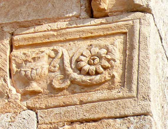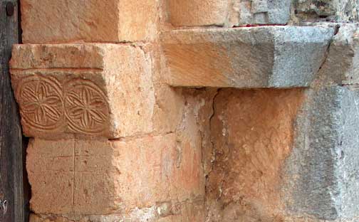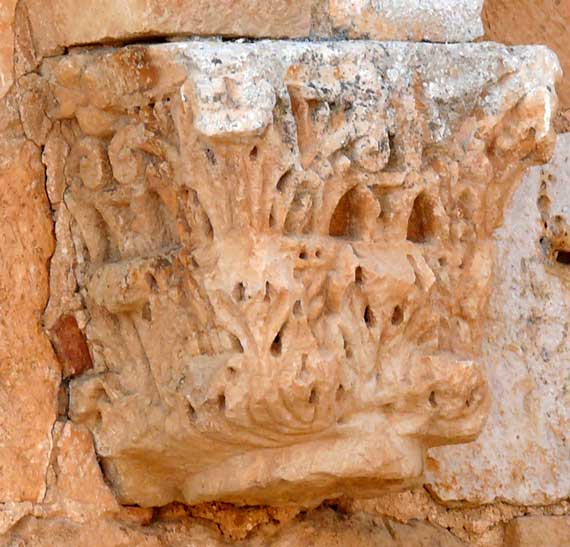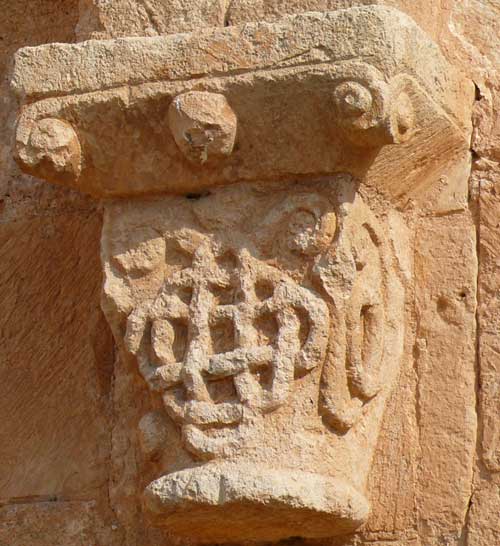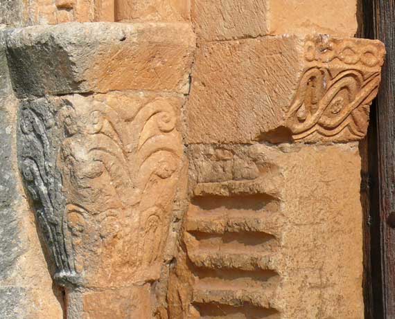 En el lado izquierdo de la portada subsiste un capitel de alta cesta y tosco dibujo caulicular. Su ábaco liso trasciende a la jamba exterior a modo de breve imposta. La pieza de apoyo del arco interior presenta, tanto en el frente como en el plano inclinado de su intradós, entrelazos y flores interiores. En la jamba se han utilizado fragmentos de pilastras estriadas romanas. |