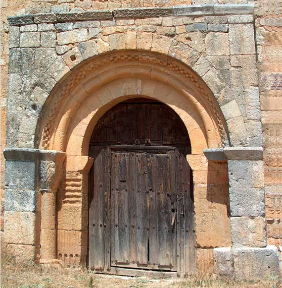 Realzada por un arimez de poco relieve se dispone en el muro sur de la nave la única portada hoy existente. Se compone ésta de tres arcos: los extremos, lisos, sin decoración alguna, cargando sobre las jambas; el central, de grueso baquetón y moldura abilletada, apoyando sobre columnas acodilladas de las que sólo la izquierda se conserva. Se remata el arimez con moldura salediza adornada con florones inscritos en círculos tangentes, puntas de diamante y dibujos geométricos. |