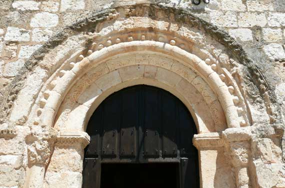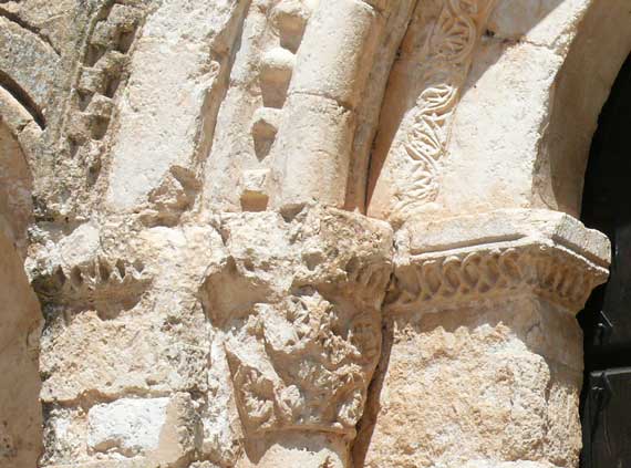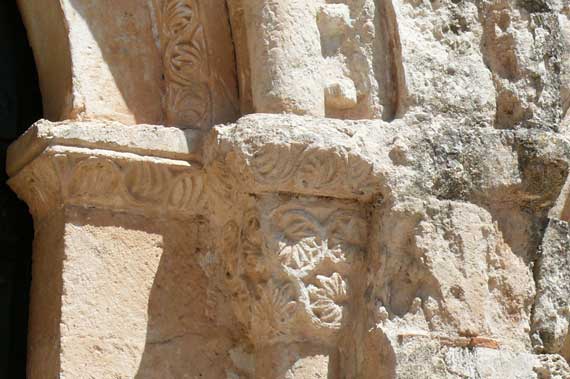 A cada lado, dos pilastras y una columnilla acodillada dan soporte al arco. En el lado izquierdo, el cimacio del capitel que se prolonga en una imposta que abarca toda la jamba se adorna con un doble filamento ondulante entrelazado. La cesta del capitel muestra florones o rosetas inscritas en círculos. |