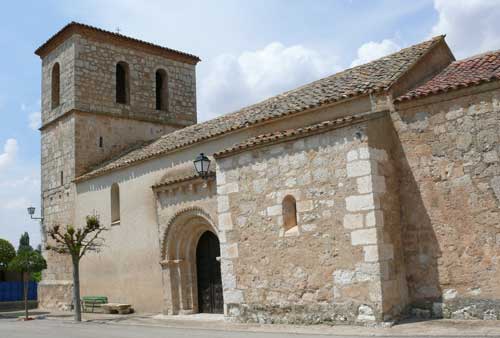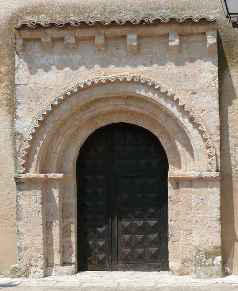 Es el único vestigio románico de la primitiva iglesia totalmente renovada. En el lienzo enfoscado de la nave resalta ligeramente un arimez de sillería en el que se abre la portada. Es ésta de arco de medio punto con tres arquivoltas, de las que la interior es completamente lisa y las otras dos de aristas molduradas. Circunda el conjunto una chambrana de puntas de diamante. Descarga el arco sobre jambas escalonadas con interposición de una imposta de nacela. |