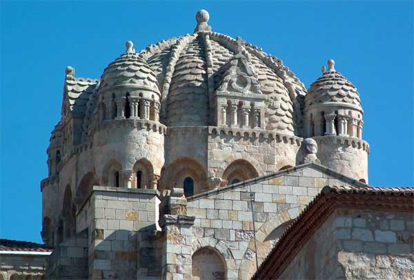Por el contrario, es argüible también, y con mucha razón, que son más las diferencias que separan los cimborrios de Zamora, Salamanca y Toro de las cúpulas de Saint-Front de Périgueux o Saint-Pierre de Angulema que las similitudes que los emparentan. Presentan un parecido exterior debido al recubrimiento de lajas de piedra que semejan una superficie escamosa, pero prácticamente quedan ahí todas las analogías. Las cúpulas francesas están constituidas por casquetes cuya superficie interior es de revolución y, por tanto, continua y lisa, y su funcionamiento estructural es el propio de estas bóvedas que descargan uniformemente las tensiones a lo largo de todo el perímetro superior de las pechinas. El abovedamiento de los cimborrios castellano-leoneses es bien distinto: un sistema de nervios, a modo de vigas de directriz curva o arcos por tranquil que apoyan sobre las columnas del tambor, constituye el armazón portante, mientras que la plementería con que se rellenan los espacios entre las barras estructurales sólo tiene misión de cerramiento. Dos formas constructivas bien diferenciadas con simples afinidades formales externas.