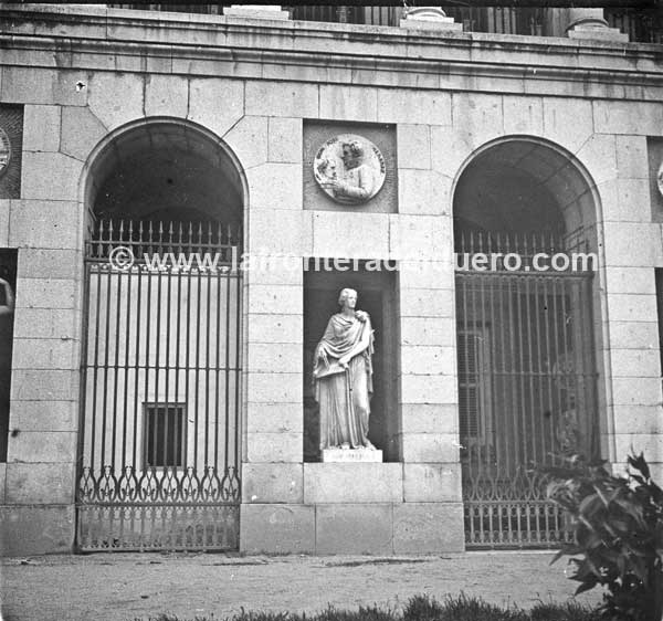 Entre las fotos no personales pero sí de sabor familiar está esta de la fachada del Museo del Prado encuadrando un fragmento en el que se encuentra el medallón con el busto en relieve de su abuelo el escultor José Álvarez Cubero. Lleva a modo de orla la inscripción DON JOSE ALBAREZ (sic). Está tomada en 1898. |