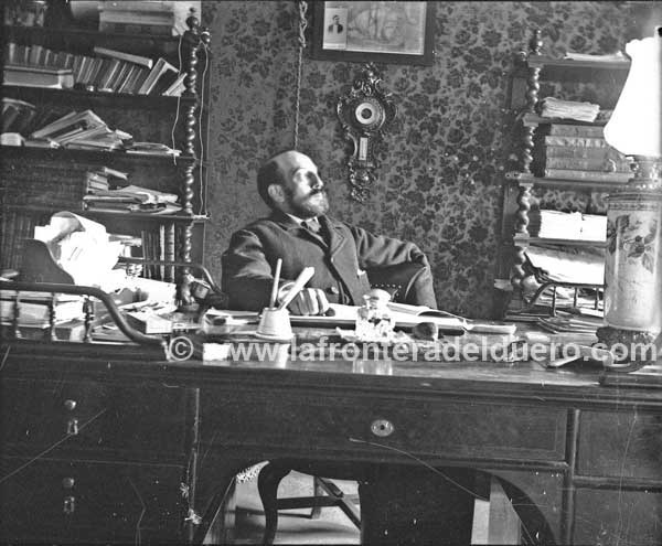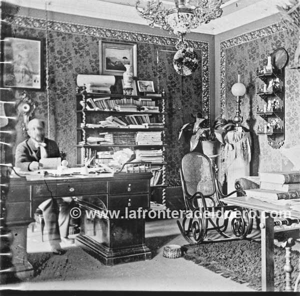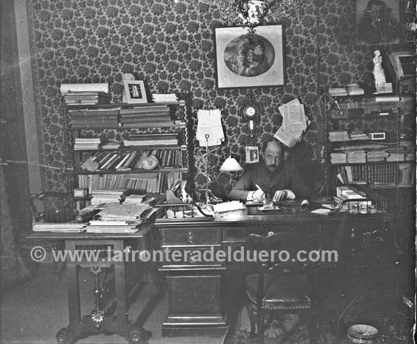 En el despacho que tenía en su domicilio de la calle Ballesta, 9-2º en Madrid, en un edificio hoy desaparecido y reemplazado por otro moderno. Esta foto no está datada pero debe de ser de los últimos años del siglo XIX. |