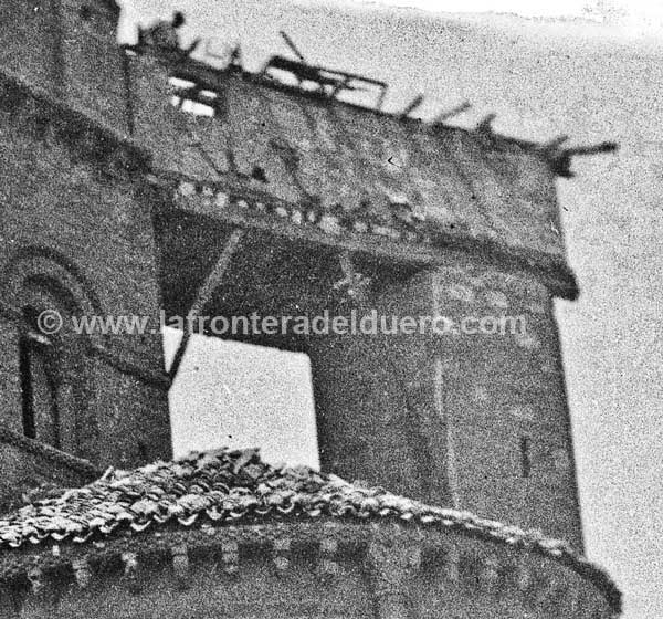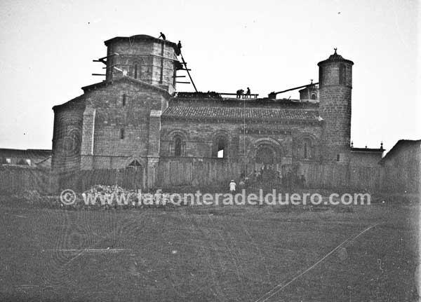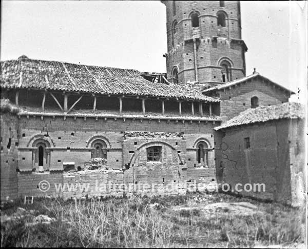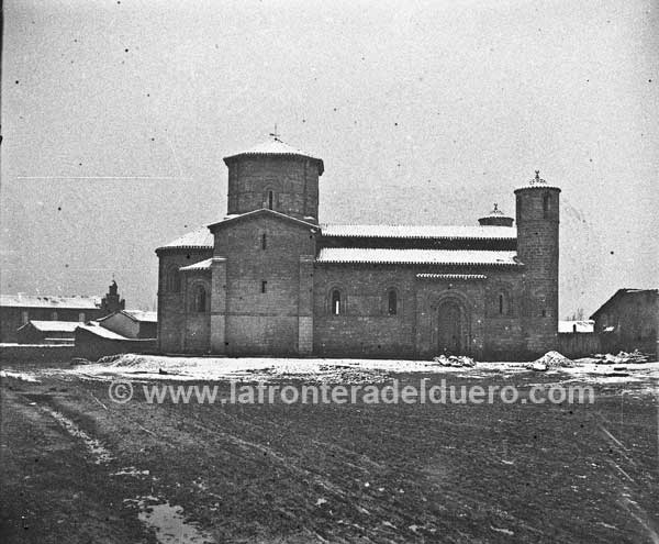 Vista meridional del templo que aporta una elocuente descripción del trance en el que se encontraba éste. Se aprecia, al igual que en la foto 01, el campanario que gravita sobre el cimborrio; también se muestra en primer plano a la derecha la sacristía que «...es modernísima; tiene sus muros de tierra con machos y verdugadas de ladrillo...», según descripción del propio M. Aníbal Álvarez, que sólo dejaba libre la ventana superior del hastial del transepto y que se hallaba prácticamente arruinada. A la izquierda se ve parcialmente uno de los husillos que flanquean la fachada occidental de la iglesia, en concreto el del vértice suroccidental. Su opuesto había permanecido intacto hasta entonces, pero éste quedó semiderruido en 1415 durante una de las revueltas que venían produciéndose con lamentable frecuencia en el barrio de san Martín. Es de notar el tejado que cubre a dos aguas el conjunto de las tres naves; sus cerchas apoyaban en durmientes soportados por pies derechos de rollizo que descansaban en el muro exterior. La cubierta primitiva era, como lo es ahora, más elevada y a doble vertiente para la nave central, y de faldones más bajos y de pendiente única para las naves laterales, pero en una de las reformas sufridas por este templo se había realzado la línea de cumbrera hasta tapar parcialmente una de las ventanas del cimborrio y se había prolongado el tejado de la nave central sobre las laterales, con lo que su borde quedaba sobreelevado con relación a las antiguas cornisas. La zona próxima al cimborrio estaba hundida, como se puede apreciar en la fotografía. En cuanto al muro de fachada presentaba su paramento exterior muy maltrecho, mantenía tres ventanas bastante deterioradas y casi había desaparecido la portada. Quedaba de ésta un arimez de poco relieve cuyo tejaroz parece haber sido estragado intencionadamente y no por ruina accidental, un arco cegado con su chambrana aún visible y un hueco ventanal practicado en el cerramiento de la antigua portada. La ventana central había perdido los fustes de sus columnillas y aún permanecía semitapiada y con restos de un tejado incrustado en ella que denotaba, unido ello al recrecido de sillarejo de esa zona del muro, la antigua existencia de alguna construcción o cobertizo adosado. |