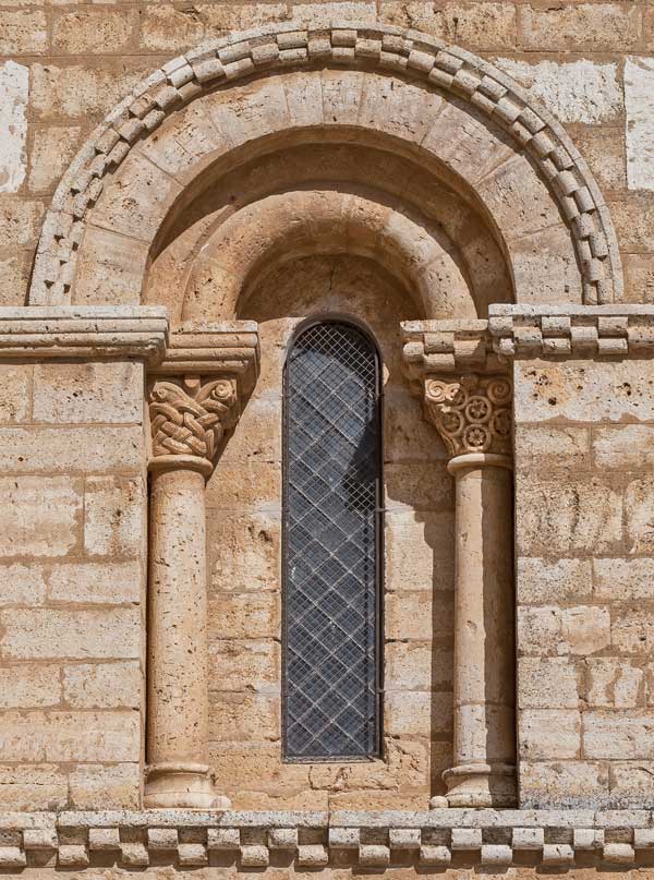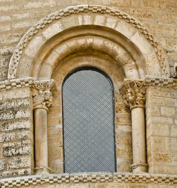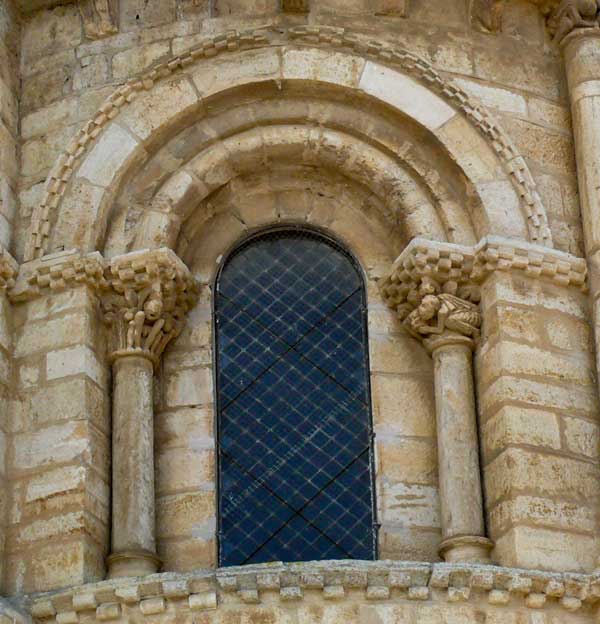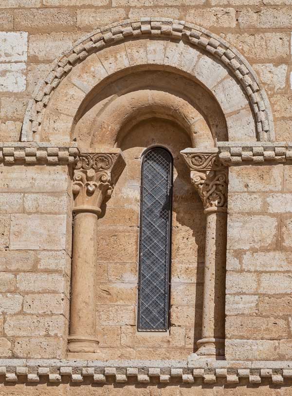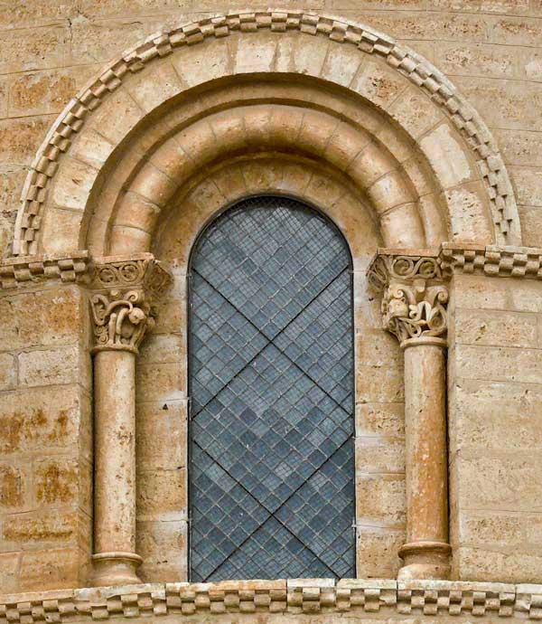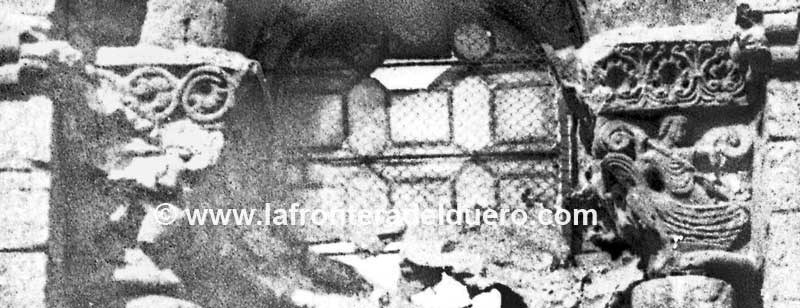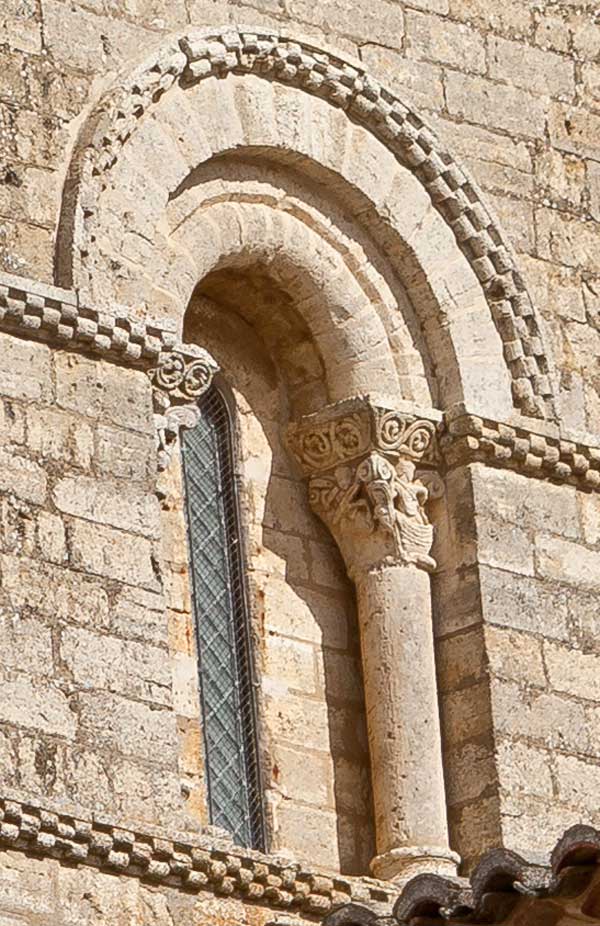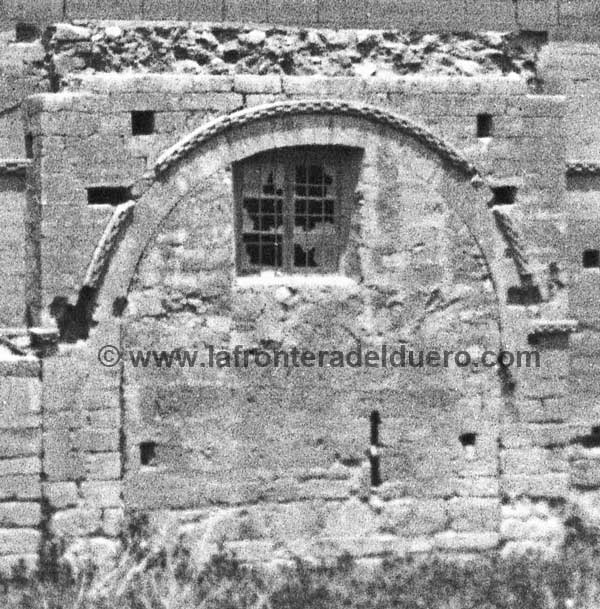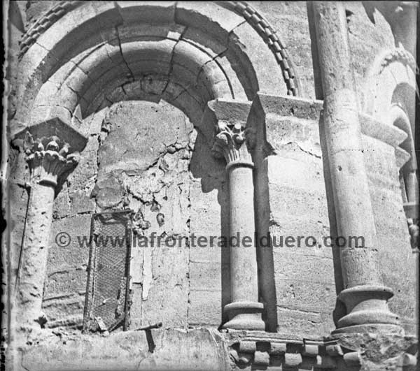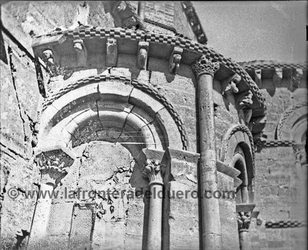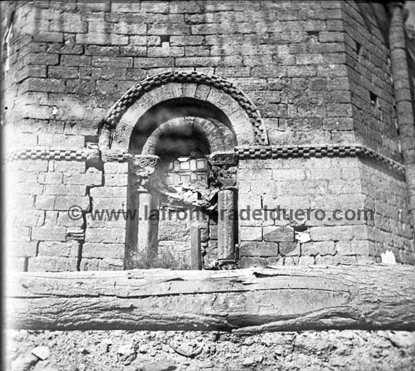 La presente fotografía es muy parecida a la anterior con un encuadre más ajustado a la ventana lateral derecha del ábside meridional. El hueco primitivo había quedado reducido a un ventanuco insignificante, observándose además la pérdida de la imposta ajedrezada inferior que corría por la base del vano. |